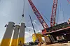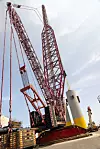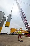 Ergänzend zum großen Raupenkran kamen zwei 200-Tonnen-Mobilkrane, die Wipp- und Hilfshubarbeiten übernahmen zum Einsatz. Damit war die Hebetechnik auf die Geometrie des Einsatzortes und die Größe der Komponenten abgestimmt. „Bei solchen Einsätzen muss ein leistungsstarker Kran mit großer Reichweite eingesetzt werden, weil die Fundamente direkt neben der Kaikante vertäut sind“, erklärt Yan Billard, Geschäftsführer von Mammoet Frankreich. „Wir haben einen CC8800 mit einer Tragfähigkeit von 1.600 Tonnen eingesetzt, ausgestattet mit einem Boom Booster, um einen 144 Meter langen Hauptausleger zu schaffen. Der Booster ist ein spezieller Abschnitt, der die Kapazität des Krans erhöht und dadurch größere Hubleistungen bei einem kleinen Radius ermöglicht“, erläutert Yan Billard.